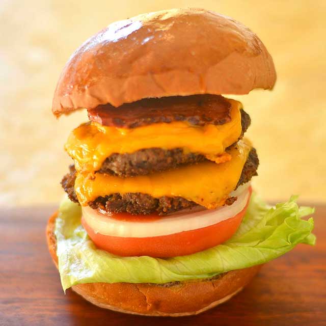 牛肉100% パティ130g×2 レタス オニオン トマト ベーコン レリッシュ チェダーチーズ ソース(マヨネーズ・マスタード・ケチャップ)