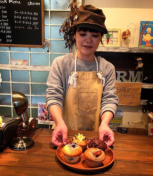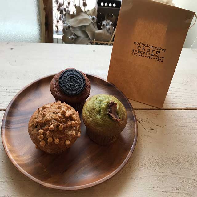 店内メニュー: マフィン(プレーン、チョコチップ、チョコオレオ、チョコレート、ブルーベリークリームチーズ、抹茶小豆、シナモンアップル、チェダーチーズ、キャラメルコーヒー、キャラメルティ)