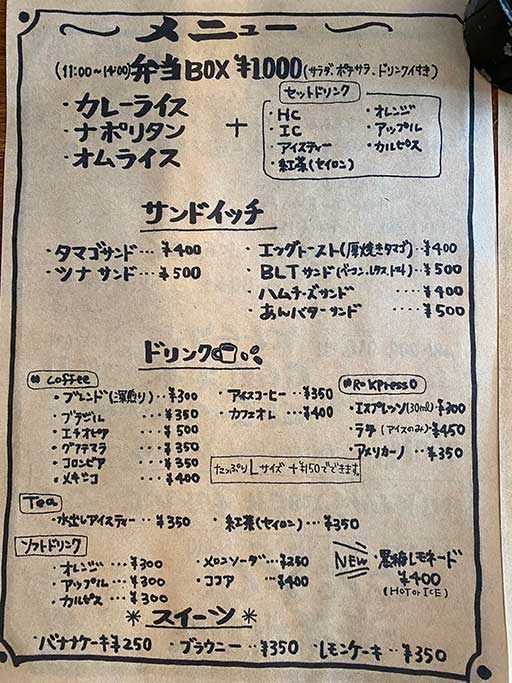 店内メニュー:コーヒー・サンドイッチ・スイーツ(ブラウニー、バナナケーキ、レモンケーキ)